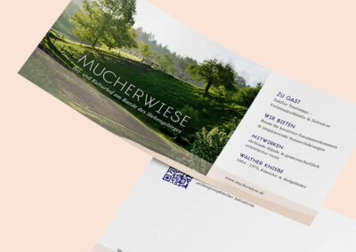 Der Bio- und Kulturhof Mucherwiese ist ein gemeinwohlorientierter Ort, der Raum für Begegnung, kulturelle Veranstaltungen, Kunst-Retreats und künstlerischen Austausch bietet, und außerdem ein integratives und generationsübergreifendes landwirtschaftliches Arbeits- und Wohnprojekt ist. Über allem schwebt der geistige Nachlass des Künstlers Walter Kniebe, der mit der Gründung der Mucherwiese schon 1935 eine „Kulturinsel“ und Zufluchtsstätte vor den Nationalsozialisten und Rückzugsraum in der Natur schuf. Gewünscht war ein neuer visueller Auftritt mit neuem Logo, Vistenkarten, Plakatvorlage und einer umfangreichen Webseite.