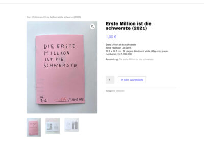 Wir haben eine Website gestaltet, die zukünftige sowie vergangene Ausstellungen zeigt. Außerdem gibt es einen Shop in dem man Artist’s Books, Kunstobjekte und ausgewählte Editionen erwerben kann. Die Website nimmt sich in ihrer Form sehr zurück, um der Buntheit aller gezeigten Künstler*innen eine eigene Bühne zu geben und sie für sich wirken zu lassen.